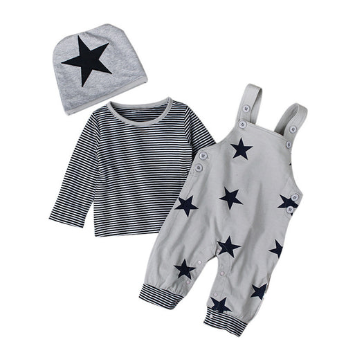 🌟【Kids 3-Piece Set】Boys' Star Overalls + Striped Long Sleeve Tee + Hat | Cotton Casual Outfit